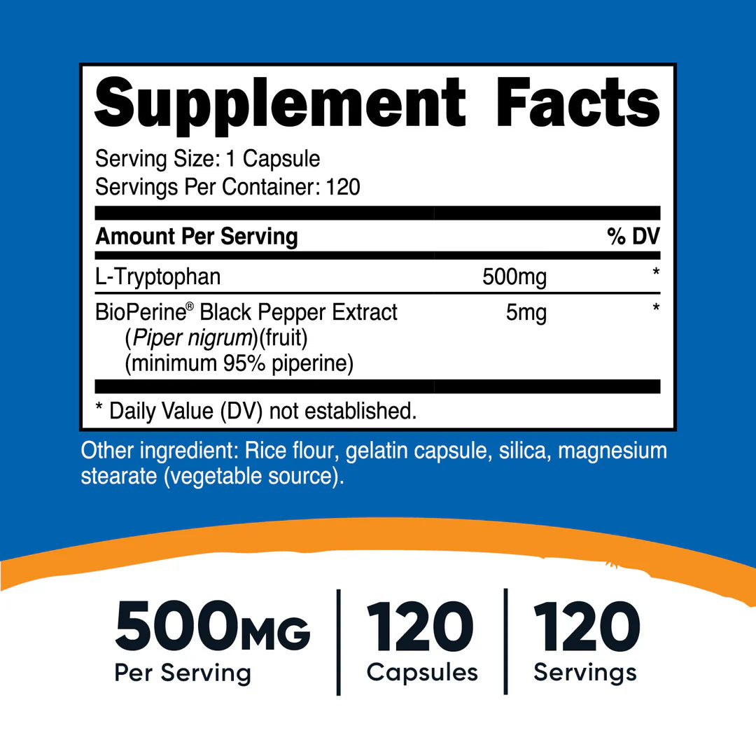 Les gélules de L-Tryptophane de Nutricost contiennent 120 gélules contenant chacune 500 mg de L-Tryptophane. Le L-Tryptophane est un acide aminé non essentiel.