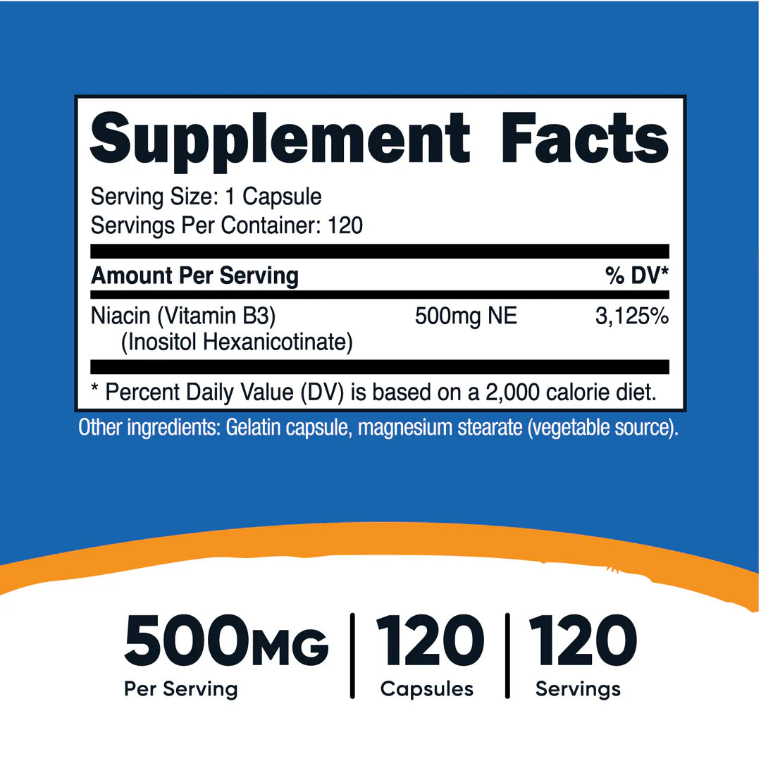 Flush-free niacin (Inositol Hexanicotinate) from Nutricost. Each capsule contains 500mg of flush-free niacin and 120 capsules per bottle.