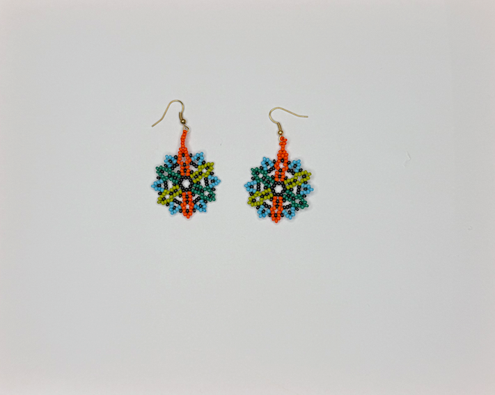 手工花朵耳环 - 蓝色、绿色和橙色珠子(Chaquiras)