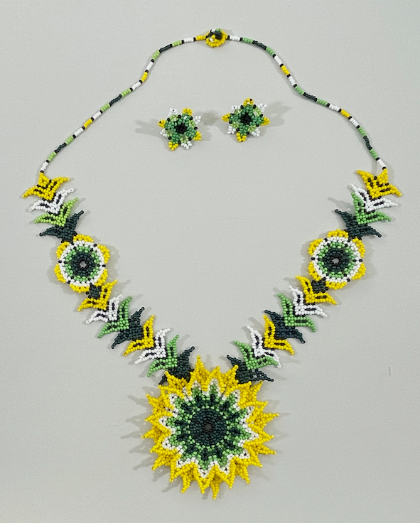 手工向日葵项链耳环套装 - 黄色、白色和绿色珠子(Chaquiras)